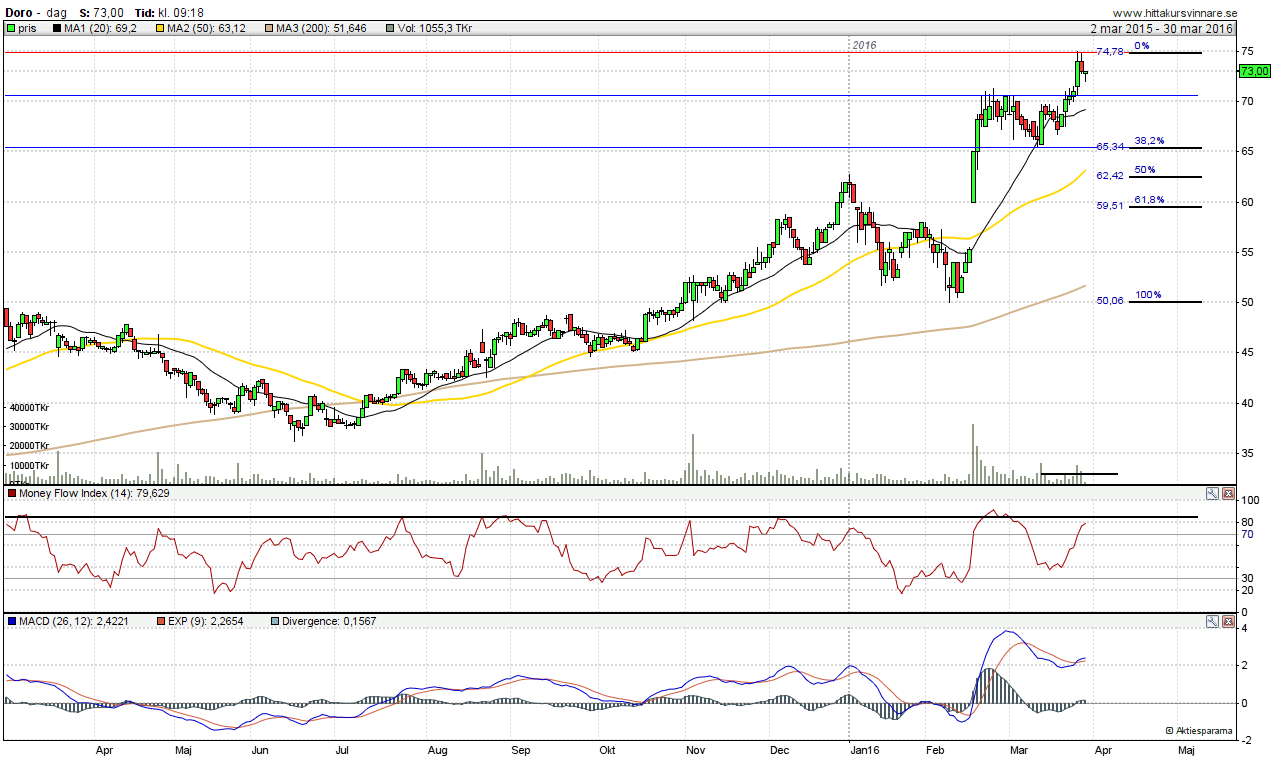 Vi publicerade en teknisk analys för Doro den 30 mars. Aktien har sen dess gått upp cirka 3 %. Den 3 maj kommer Doro att presentera Q1 resultatet. Vi estimaterar att bolaget kommer presentera en omsättning om 475 MSEK samt ett rörelseresultat på 23 MSEK (Q1 2016E)