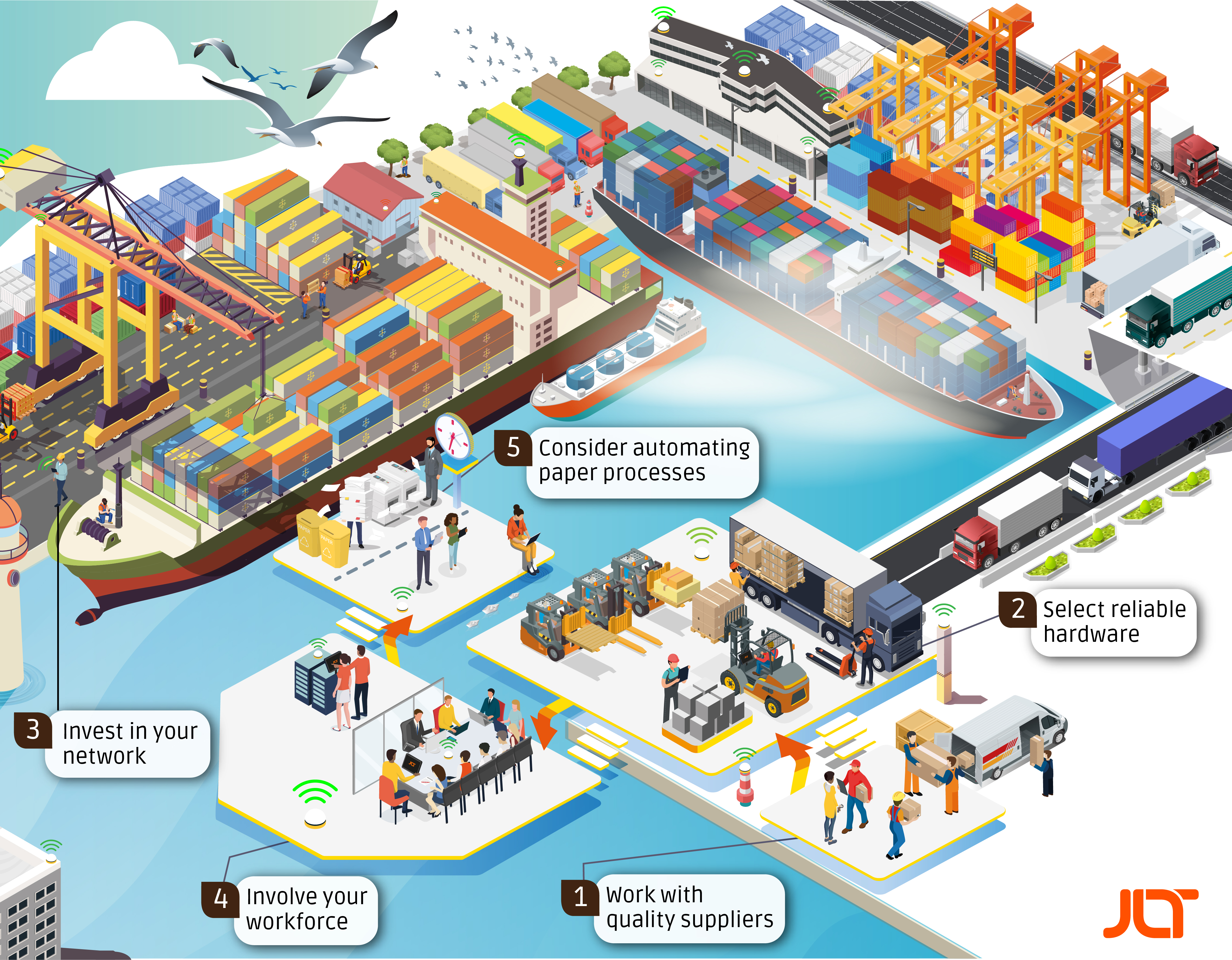 ”Five ways to make IT your port’s hero not its headache” är del tre i JLT:s serie av gratis expertguider och befäster företagets erfarenhet av att ha arbetat med hamnar och containerterminaler under ett kvarts sekel. I guiden identifierar JLT fem återkommande utmaningar som påverkar IT- och driftschefernas arbete med att öka prestanda och produktivitet i sina hamnar: hur man kontinuerligt håller sig uppdaterad och framtidssäkrar sina IT-system, hur man optimerar nätverksanslutningen över stora områden (ofta utomhus), hur man anskaffar hårdvara som är lämplig för hamnändamål, hur man väljer en pålitlig leverantör samt hur man engagerar medarbetarna.