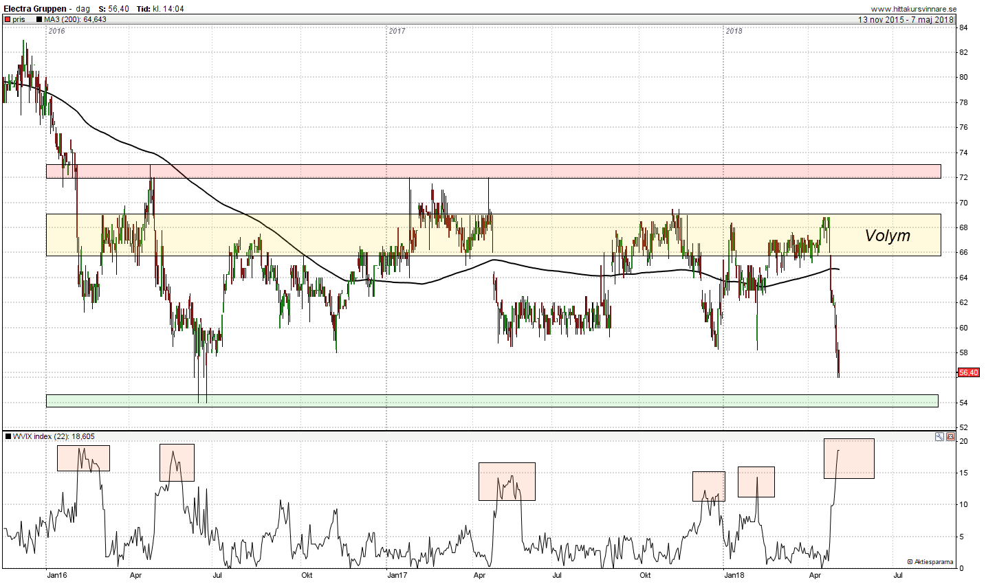 <p>Electra Gruppen har sedan början av 2016 handlat i en range mellan 72,00 kr och 54,00 kr. Aktien har flertalet gånger testat av taket och golvet i denna range. Efter en tids konsolidering i zonen så har den långsiktiga trenden blivit neutral, detta kan vi se då det glidande medelvärdet MA200 varit flat under en längre tid.</p> <p>Under denna tid så har störst andel av volymen gått till avslut i den markerade zonen mellan 66,00 och 68,00 kr. En zon som aktien återkommit till under flertalet gånger. Denna zon är även utbrottszon för de senaste dagarnas kursfall.</p> <p>Genom att studera WVIX-indikatorn, ett syntetiskt volatilitetsindex för aktien, så kan man se mönster av lokala bottnar i aktien i samband med höga värden på indikatorn. På samma sätt så har låg volatilitet ofta sammanfallit med lokala toppar i aktien. Indikatorn har under de senaste dagarna handlat med mycket hög volatilitet, den högsta sedan maj 2016.</p> <p>Stöd: 54,00 kr<br /> Motstånd: 72,00 kr</p>