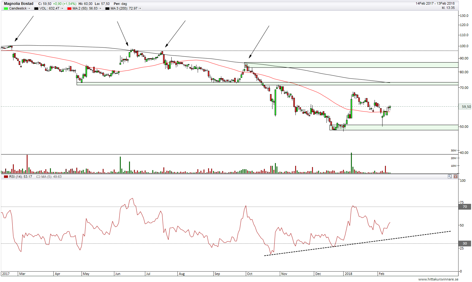 <p>Bostadsutvecklaren Magnolia noteras under MA200 som karaktäriseras av en fallande riktning. Detta indikerar att den långsiktiga trenden är negativt. Under den senaste tiden har aktien emellertid börjat uppvisa vissa positiva signaler, vilka härleds till ett genombrott av MA50 samtidigt som RSI-indikatorn noterar en positiv divergens mot aktiekursen. Det senare är ett tecken på att hastigheten i kursnedgången har avtagit och att aktien därför kan stå inför en uppåtrekyl. Visserligen inleddes året med just detta, men att aktien fortsatt handlas ovanför MA50 tolkas som att rekylen inte har gått tillända.</p> <p>Följaktligen finns det nu utrymme för en upprevidering mot det signifikanta motståndet på MA200 (73,00 kr). I denna härad är det dock troligt att köparna kan bemöta ett tufft säljtryck. Orsaken hänförs kursens historiska benägenhet att vända ned vid detta medelvärde (se graf). Vidare skulle utbrott upp igenom denna nivå vara en indikation på att den långsiktiga trenden kan gå mot en alltmer neutral riktning. Nästa motstånd återfinns då vid 86,25 kr, följt upp av 97,00 kr.</p> <p>På nedsidan agerar psykologiska 50,00 kr som en nivå där köpare funnit aktien åtråvärd. Vid punktering indikeras en fortsatt kursnedgång mot 39,00 kr (tidigare stödnivå från 2015).</p> <p>Motstånd: 73,00 kr / 86,25 kr / 97,00 kr<br /> Stöd: 50,00 kr / 39,00 kr</p> <hr /> <p><em><img class="img-responsive" style="float:right" alt="Introduce aktieanalys" src="/link/13ecd906ee4d4887a555f4552a326d2b.aspx" height="59" width="59" />Teknisk analytiker<br />Simon Granath<br />simon.granath@remium.com</em> </p>