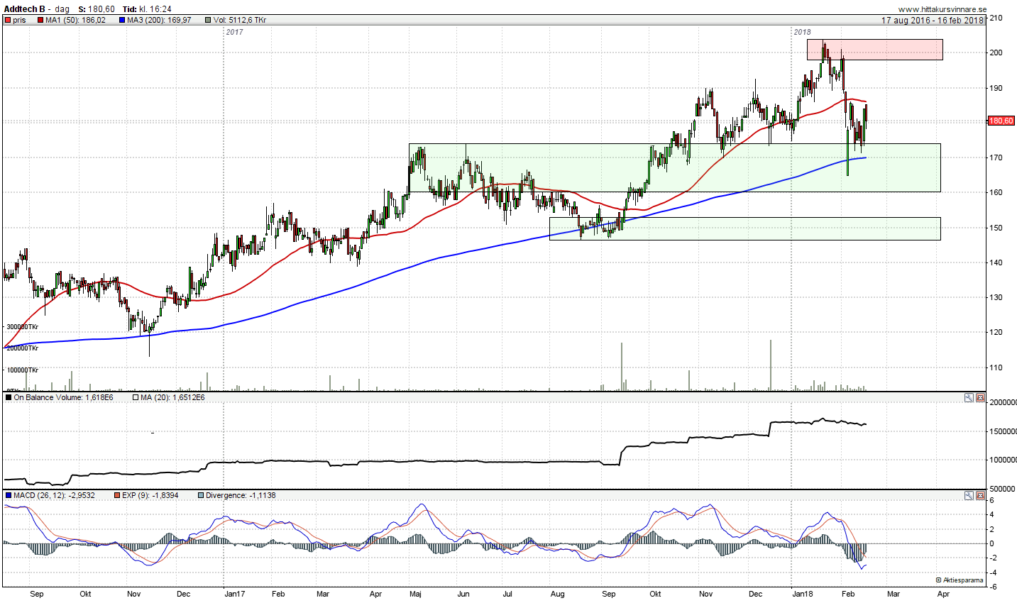 <p>Addtech har under de senaste veckorna rekylerat ner från de toppnivåer som vi etablerades början av året. Aktien har etablerat sig under MA50 (ca. 187,00 kr) vilket ger kortsiktiga negativa signaler. Samtidigt så har den ej lyckats bryta igenom MA200 (ca. 170,00 kr) trots flertalet försök, vilket indikerar på styrka. Kursen kan sannolikt fortsätta att konsolidera mellan dessa glidande medelvärden. I samband med testet av MA200 så handlade vi även i en stödzon i form av gamla lokala toppnoteringar. Denna zon har tidigare agerat stödzon och kan sannolikt även vara det framgent.</p> <p>MACD-indikatorn har under de senaste dagarna visat en positiv divergens mot aktiekursen. Det indikerar på en botten i aktiekursen.</p> <p>OBV-indikatorn har under de senaste veckornas nedgången legat kvar på samma nivåer som innan kursfallet. Detta indikerar på att kursen handlat på relativt låga volymer under de röda dagarna, något som sänker signifikansen för denna rörelse.</p> <p>Om aktien bryter över motståndszonen runt MA50 så finns nästa motståndszon vid psykologiskt viktiga 200,00 kr. Skulle aktien istället bryta ned under stödzonen vid MA200 så har finns nästa stöd i linje med gamla lokala bottennoteringar kring 150,00 kr.</p> <p>Motstånd: 187,00 kr / 200,00 kr<br />Stöd: 170,00 kr / 150,00 kr</p>