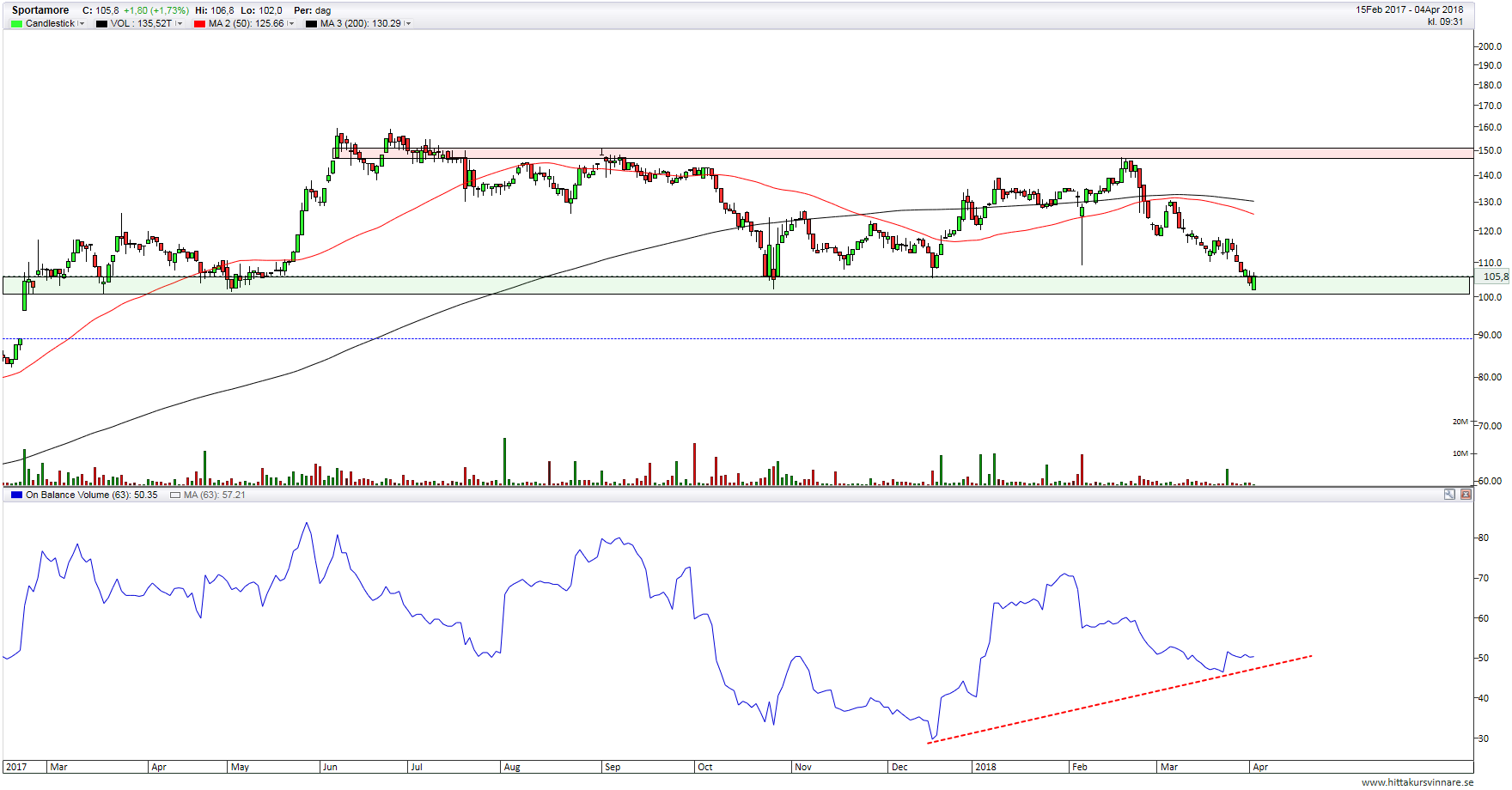 <p>Sportamore noteras under ett sidledes riktat MA200 vilket indikerar en neutral långsiktig trend. Sedan Q4-rapporten i slutet av februari har aktien emellertid successivt trendat nedåt, med en kursnedgång om ca 30%. Vid den rådande kursen om ca 104,00 kr är det dock möjligt att köpare kan ta över taktpinnen. Detta då det är en zon som aktiekursen flera gånger testat av, men där det aggregerade investerarkollektivet funnit aktien köpvärd. Följaktligen kan aktien nu stå inför en uppåtrekyl. På ovansidan noteras motstånd på 110,00 kr, 130,00 kr (MA200) samt kring 150,00 kr.</p> <p>Vidare kan vi utläsa en positiv divergens i OBV-indikatorn, vilket signalerar att det sker större handelsvolym på uppgångsdagar än nedgångsdagar. Signalen tolkas positivt, och indikerar att större aktörer tenderar att köpa snarare än att sälja.</p> <p>Skulle å andra sidan stödet på psykologiska 100,00 kr ge vika finns det utrymme för en kursnedgång mot en GAP-stöd på 89,00 kr. Kursnotering i denna härad skulle dessutom vara en bekräftelse på att den rådande neutrala trenden övergått mot en negativ riktning.</p> <p>Motstånd: 110,00 kr / 130,00 kr / 150,00 kr<br /> Stöd: 100,00 kr / 89,00 kr</p>