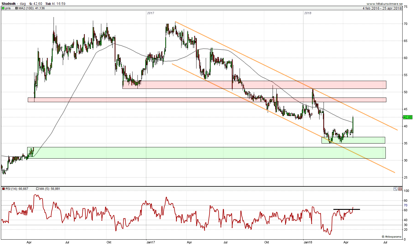 <p>Efter dagens Q1-rapport i Studsvik så gör aktien ett försök på att bryta den negativa trend som vi handlat i sedan början av 2017. Denna negativa trend ser vi tydligt på det glidande medelvärdet MA100, då detta tydligt pekar nedåt. Aktien har idag etablerat sig över detta glidande medelvärde och gör därmed ett försök att vända denna trend.</p> <p>I RSI-indikatorn så har vi efter dagens rörelse sett ett utbrott över tidigare toppar vilket indikerar fortsatt uppgång för aktien. Detta sker efter en längre tids divergens i indikatorn.</p> <p>Om aktien framgent håller i dagens positiva trend så har vi ett större motstånd i linje med trendkanalstaket som aktien ej lyckades bryta över i början av året. Skulle aktien etablera sig över taket så har vi nästa motståndsnivå i linje med högvolymszonen á 48.00 kr.</p> <p>Skulle aktien istället vika ned med den långsiktiga trenden så har vi stödnivå i linje med årets lägsta-noteringar. Straxt där under har vi även en stödzonen som vi gapade upp från i mitten av 2016.</p> <p>Stöd: 35,00 kr / 32,00 kr<br /> Motstånd: 45,00 kr / 48,00 kr</p>